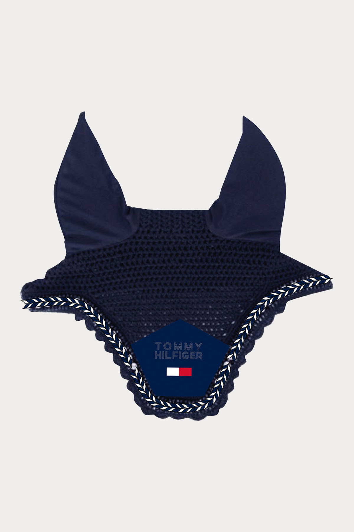 Designed for sensitive horses, the LONDON “Soundless” Fly Hood combines function and style. The ears are made from thick, elastic material that absorbs sharp noises, helping your horse stay calm and focused. It maintains moisture-wicking properties for extra comfort, ensuring a secure fit under the bridle. Finished with reflective TH logo print, silicone Tommy flag logo, decorative rope trim, and a scallop knit edge in Tommy’s signature sport colors.
