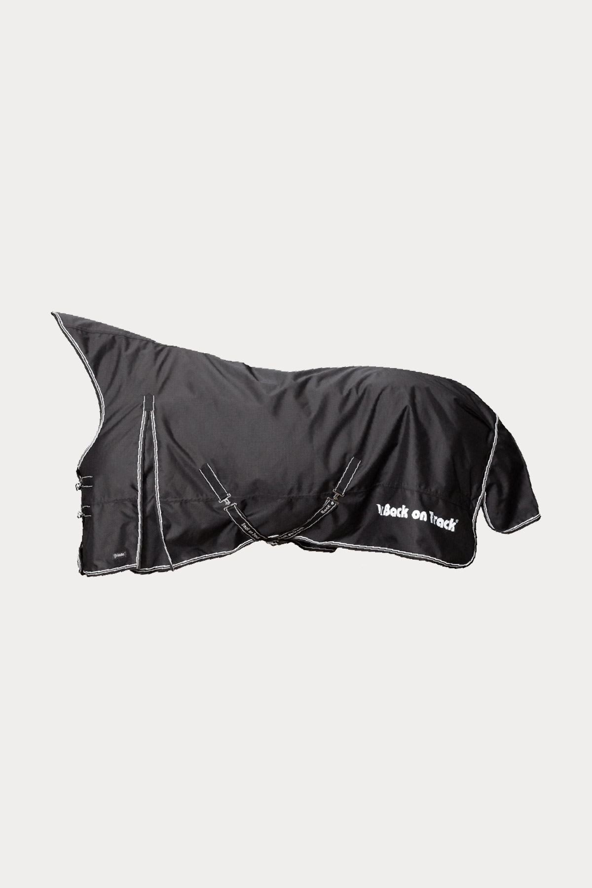“Brianna” is designed with a half neck and a large tail flap for extra protection against rain and windy conditions. Glossy lining over the shoulders, mane, and tail prevents chafing and helps maintain your horse’s coat. The tail strap features a plastic coating for easy cleaning.