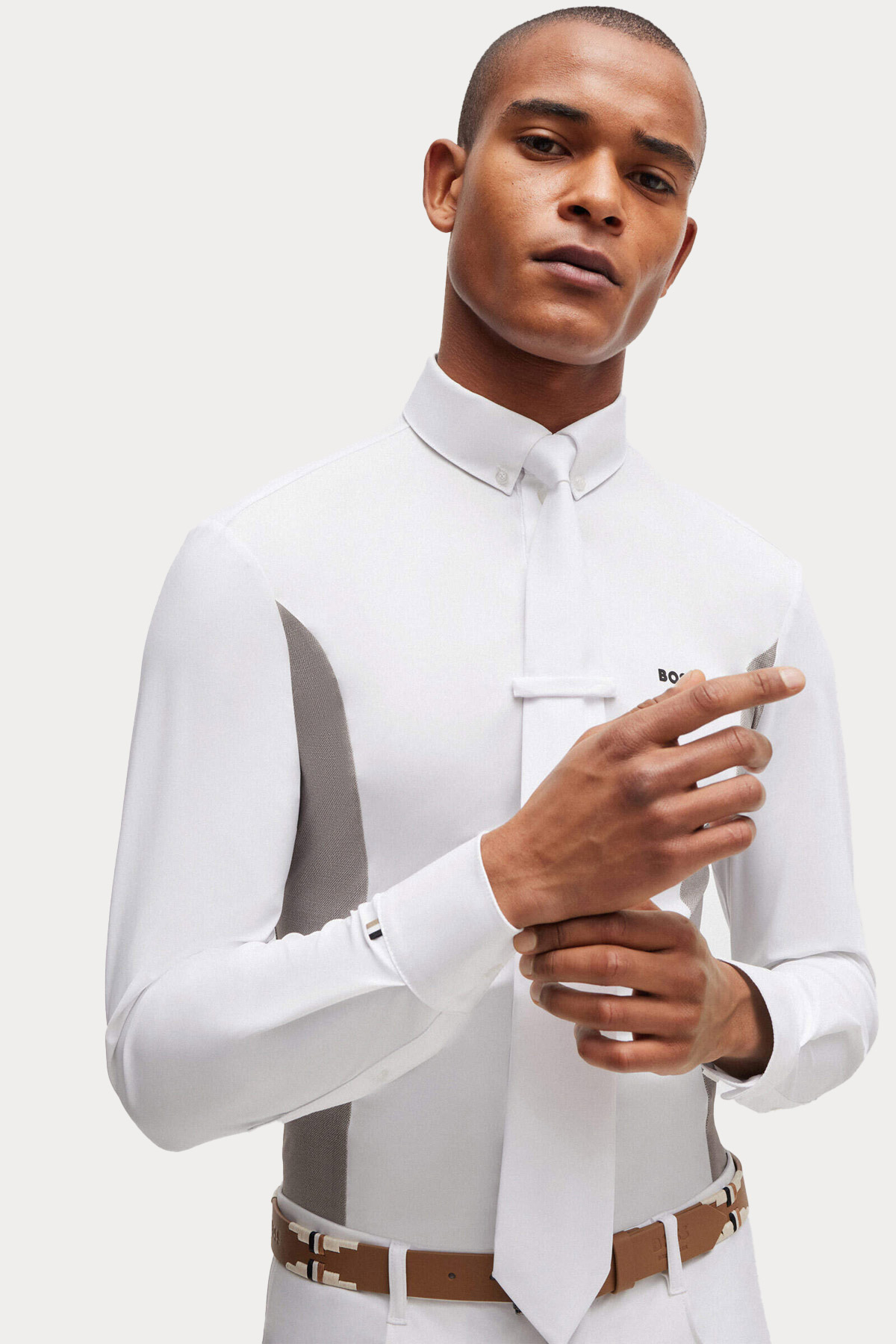 A discreet BOSS logo and signature stripe reflect the shirt’s refined identity—professional yet quietly bold. Designed for both presentation and performance, this shirt blends technical innovation with timeless style, making it a trusted staple in every competitive rider’s wardrobe.