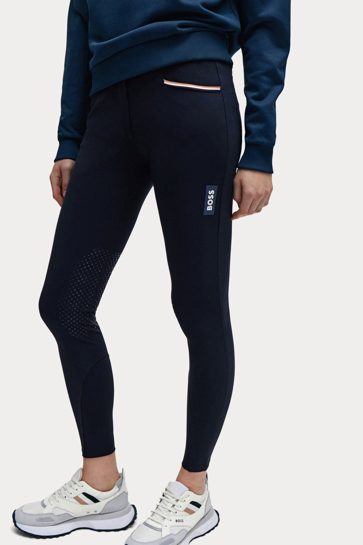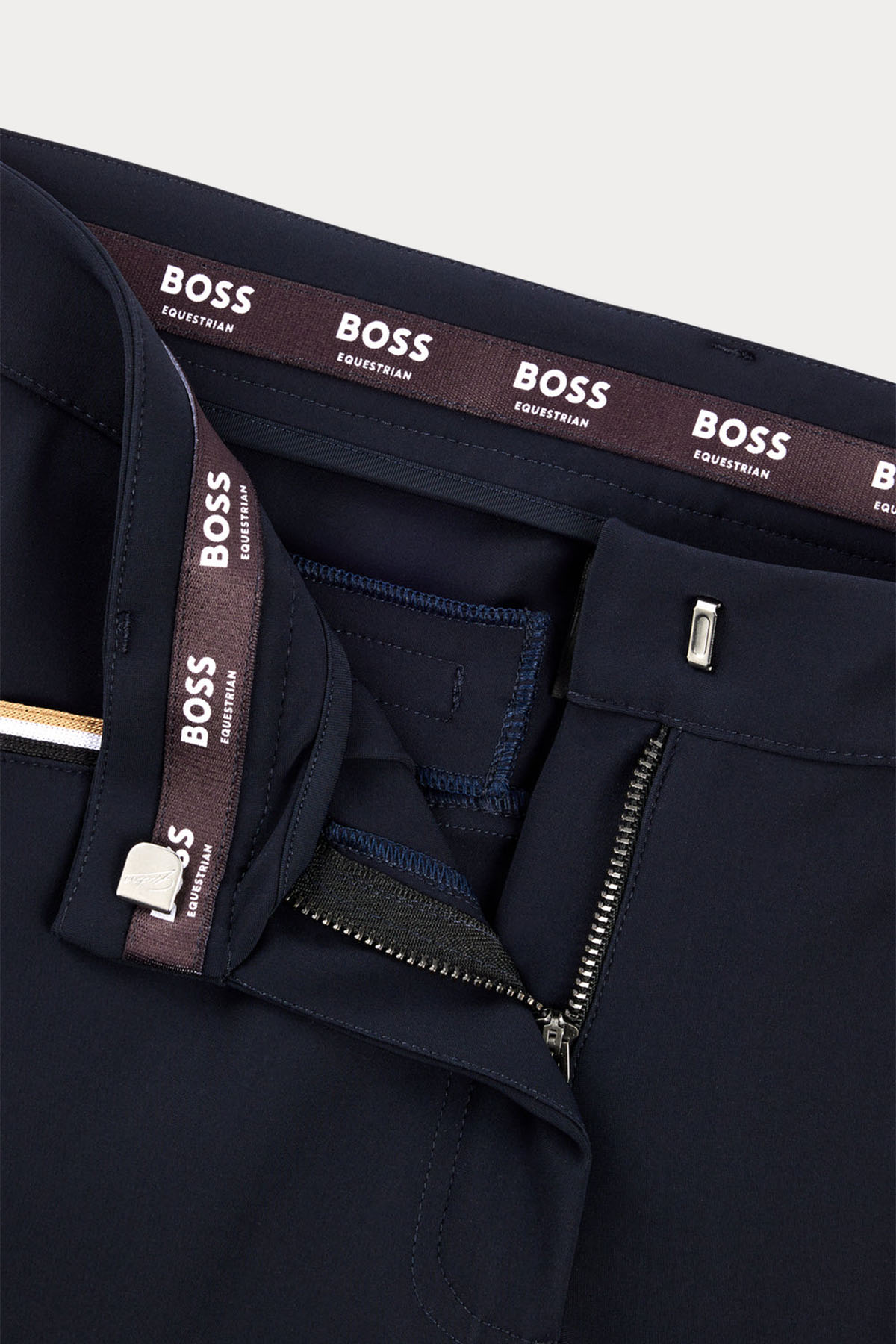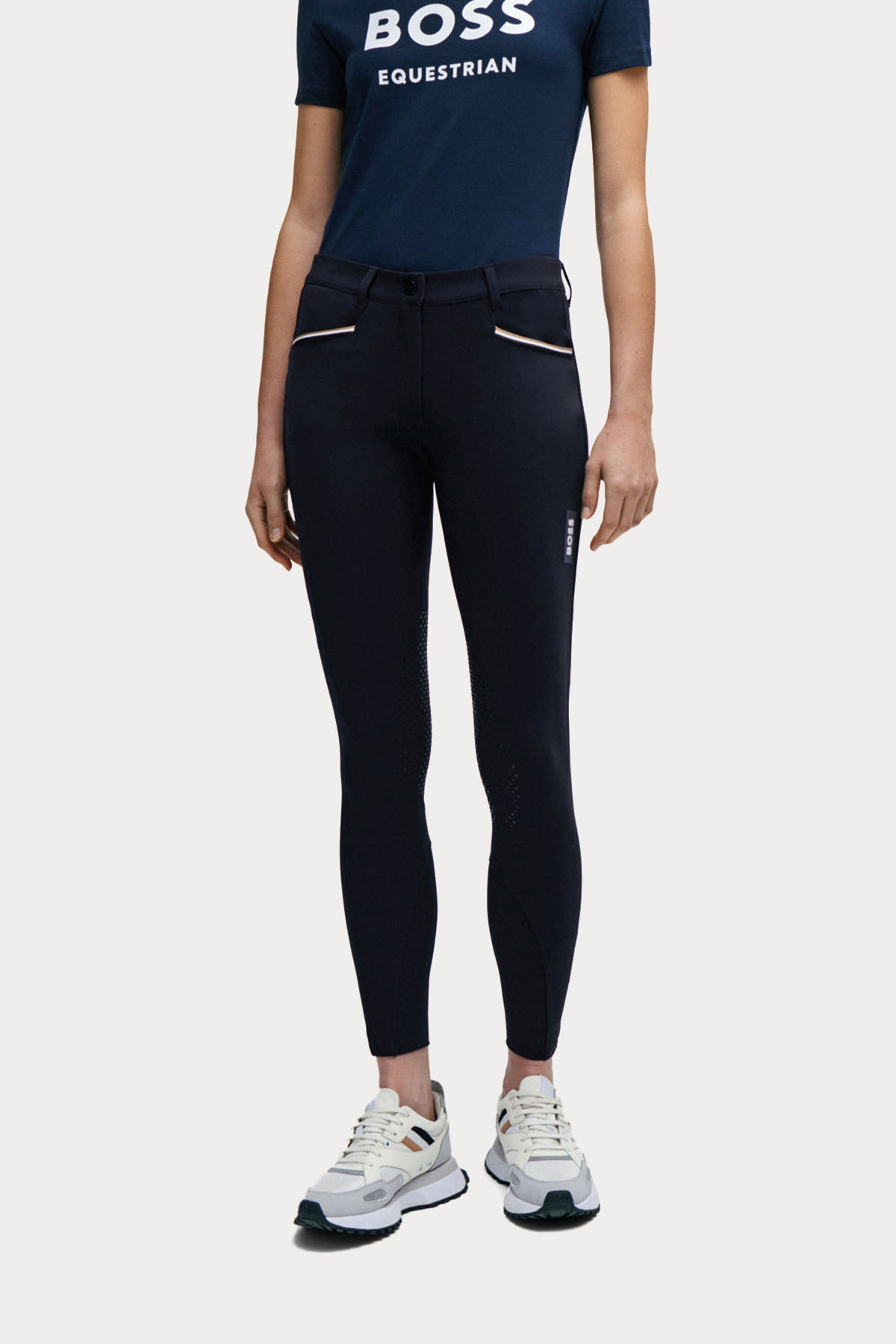 Featuring a flattering mid-rise shaped waistband, these breeches fasten with a zip and closure hook, proudly displaying the BOSS logo. The slimline jersey inserts at the base of the legs ensure a smooth fit under your riding boots, while stylish details like the BOSS Signature Stripe tape and navy silicone logo patch on the thigh add a touch of sophistication.