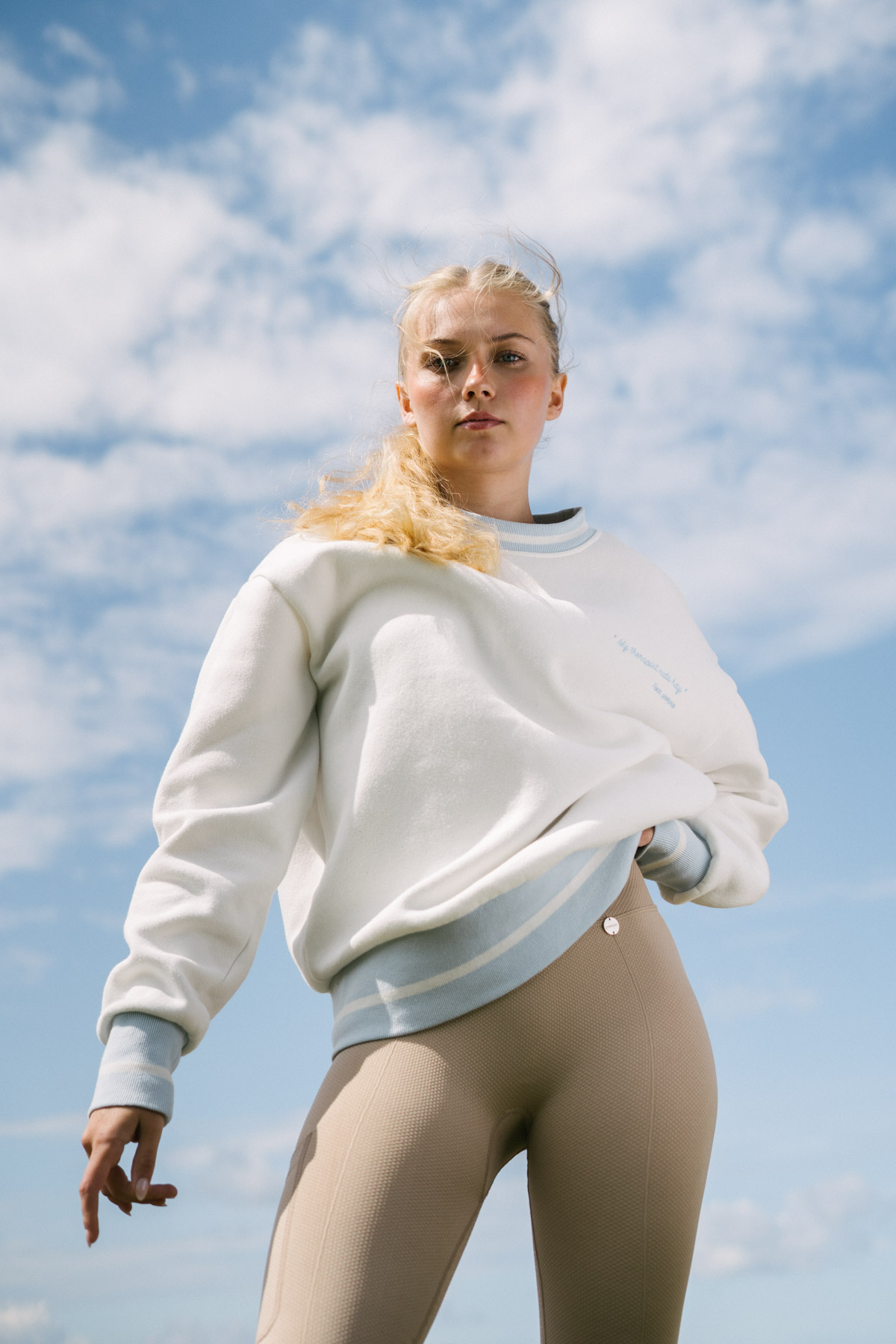 Crafted from soft and cozy fabric, it guarantees ultimate comfort while in the saddle. The loose and comfortable fit provides unrestricted movement, allowing you to fully immerse yourself in your passion for riding. Embroidery text on front and elegant blue details on the sleeves and neck.