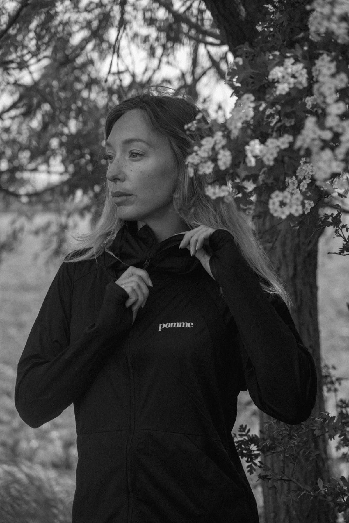 Made from a featherlight technical fabric (88% Polyamide, 12% Elastane), the Clara moves with you while keeping you cool under pressure. A high collar and adjustable hood provide extra coverage, and the removable visor on the hood offers a smart, versatile touch for varying weather conditions. Two zippered side pockets keep essentials secure, while a front zipper allows for easy layering and ventilation.