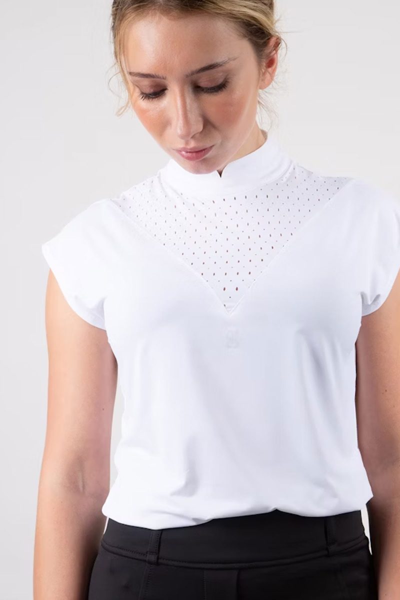 Featuring laser-cut detailing inspired by classic Broderie anglaise, the Dahlia top brings a touch of heritage style to a technical performance garment. With front and back ventilation panels and a sleek double collar stand, it offers both functionality and polish for serious riders. Whether you’re in the warm-up ring or mid-test, this top is built to support your ride with comfort and grace.